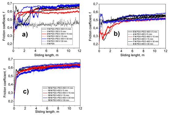 The dependence of the friction coefficient (f) on the abrasion time under a given load of the PSA and the PEO coating, at different voltages (350 V (a), 400 V (b), and 450 V (c)), and times (5–30 min) without and with PSA pre-treatments.