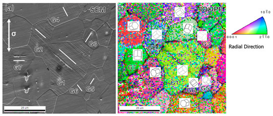 In order to obtain the crystallographic orientation of the crack initiation site, an area containing secondary cracks on the surface of the specimen at 130 MPa was analyzed by EBSD, as shown in Figure 5. In the SEM image, slip markings are visible at the surface, especially in coarse grains. Two fatigue cracks initiated along the slip markings in the interior of Grain 1. The propagation of the below one was blocked by the grain boundary and the upper one stopped propagating in the interior of its neighboring grains. In the combined modes of IQ and IPF, it was confirmed again that almost all the slip markings agreed with the basal plane as indicated by the orientation of crystal lattice. The fatigue crack paths within the Grains 1 and 3 were parallel to the basal plane. This observation provided direct evidence that basal slip was involved in the formation of the fatigue crack. In Grain 2, the basal plane was approximately perpendicular to the crack path, so the crack tip was branched during the propagation as indicated by white arrows in Figure 5. The bifurcated crack on the upper side was also parallel to the slip bands. Therefore, the fatigue crack in this alloy preferred propagating along the basal slip bands to other directions.