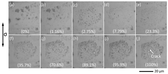 Figure 4 shows the evolution process of slip markings within a grain on the specimen surface until the initiation of a secondary crack from the slip bands (120 MPa, 3.51 × 105 cycles). The ratio of the cyclic number (Nc) to total fatigue life (Nf) is inserted within each image. The grain surface became a bit rough almost from the beginning of fatigue test (1.16%), due to the activation of basal slip. Along with the accumulation of micro-plasticity, the grain was filled with slip markings. Finally, a crack initiated from the slip bands as indicated in Figure 4j. The fatigue crack initiation resulted in the cracking of grain along slip bands. Furthermore, it can be observed that the evolution of slip markings is strictly limited within the interior of grain, and the grain boundary could be clearly identified by the saturation of slip bands at the end of fatigue testing. Meanwhile, neighboring grains kept in elastic deformation during the whole period. The plasticity localization at 120 MPa is more remarkable than that at 130 MPa, as shown in Figure 3. Therefore, as the decreasing of applied stress, a limited number of grains could be slip-activated, due to its lower resolved shear stress of basal slip system. As a result, the slip markings were observed at isolated grains with favorable orientation for the basal slip.