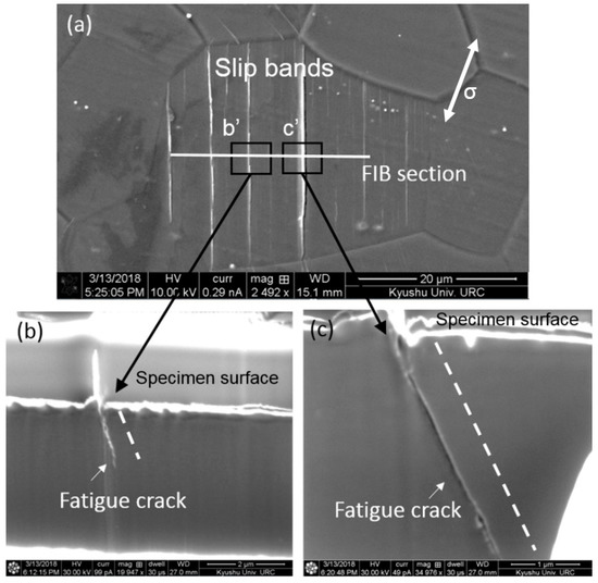 After the crack initiation along slip bands, it would propagate from the surface into the matrix. To gain further understandings of crack behaviors beneath the surface, focus ion beam (FIB) technique was used to section the slip-induced crack. Figure 6 shows the cross-section of the relationship between the slip bands and crack path. Slip-induced cracks could be observed and they were parallelly distributed in the interior of a grain. The white line plotted in Figure 6a indicated the section location by the FIB. The cross-section of location b’ in Figure 6a is shown in Figure 6c, in which a fatigue crack was initiated from the root of intrusion at specimen surface. Generally, the dislocations within slip bands could be released at the surface, forming extrusion and intrusion [15,16]. As a result, the evolution of slip bands resulted in surface roughening during fatigue testing. Over an increasing number of cycles, the stress concentration and extrusion height increase assisting in crack initiation at slip bands [17]. Another example of a sectioned slip band is shown in Figure 6c. surface slip-induced crack initiation was confirmed again, and the crack path beneath the surface is very straight. Besides, the direction of fatigue cracks both in Figure 6b,c was consistently oriented as indicated by white dash lines. Since basal slip was predominant in cyclic deformation as we observed in Figure 3 and Figure 5. It can be deduced that fatigue crack preferred to propagate along the basal plane after the initiation at surface slip markings.