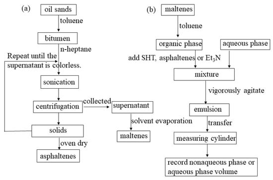 The experimental procedures of the preparation of asphaltenes, maltenes, emulsions and demulsification are shown in Figure 1. The bitumen was extracted from 150 g oil sands through the toluene solvent extraction process. After extraction, the bitumen (2 g) was added to a conical flask, and 90 mL n-heptane was added. The bitumen was sonicated at 50 °C for 30 min. After sonication, the mixture was centrifuged at 8500 rpm for 15 min. After the centrifugation, the supernatant was transferred into a 500 mL conical flask. The insoluble solids were deposited back into the conical flask. The centrifugation and precipitation processes were repeated with additional 100 milliliters n-heptane until the supernatant was colorless. The n-heptane was removed by a rotary evaporator, leaving the maltenes. Then, the insoluble solids were dried in a vacuum oven at 80 °C, and the solids were the asphaltene samples. The maltenes were transferred into a flask to mix with the toluene, obtaining a mixture with maltenes at a concentration of 1.2%. The organic phase was adjusted by adding SHT, asphaltenes or Et3N. Twenty milliliters deionized water and 30 mL organic phase were mixed and transferred into a 100 mL round-bottom flask, and stirred at 900 rpm for 220 min. Then, the mixture was quickly transferred into a measuring cylinder, and the precipitated nonaqueous phase volume or aqueous phase volume were recorded.