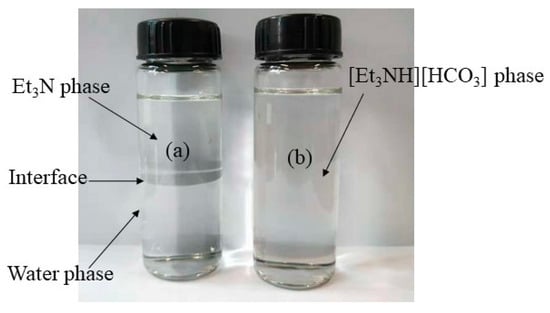 When Et3N is exposed to CO2, it is hydrophilic and even has complete miscibility in water. The CO2 injection is stopped until the interface between the two immiscible phases disappears (Figure 2b), which means that the reaction reached the equilibrium state and the SHT solution formed. The equation of SHT formation is [1,24]: