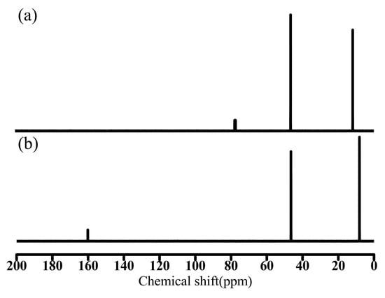 Et3N and SHT were characterized by 13C-NMR spectra, as shown in Figure 4. The chemical shifts of Et3N at 11.78 and 46.40 ppm were assigned to the –CH3 and –CH2– groups, the solvent peak is found at 77.33 ppm (Figure 4a). The chemical shifts of SHT at 8.13 and 46.47 ppm were assigned, respectively, to the –CH3 and –CH2– groups of [(CH3CH2)3NH]+ while that at 160.15 ppm was attributed to the carbon atom of [HCO3]− (Figure 4b). These indicated that SHT has formed successfully.
