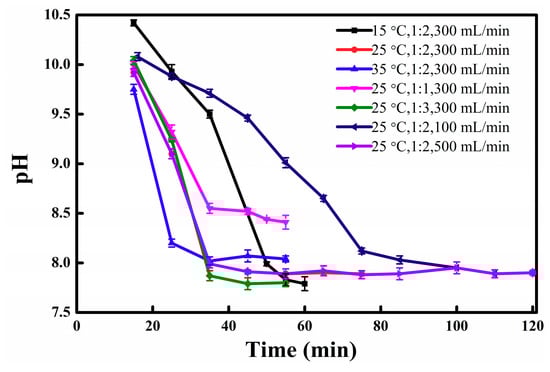 The variation of solution pH as a function of reaction time at different temperatures, Et3N/H2O volume ratios, and CO2 injecting rates.