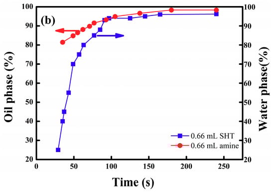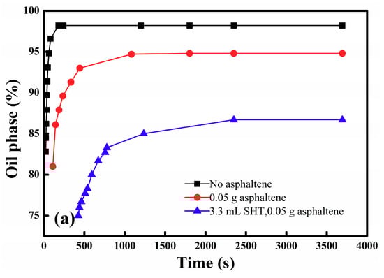 The role of Et3N or SHT in stabilizing maltenes-in-water emulsions is shown in Figure 6b and Figure 7d,e. Since the demulsification of maltene–water emulsions by SHT is too fast to observe, the water phase is used to quantify the volume of emulsions. Comparing Figure 7d,e, SHT could accelerate demulsification but Et3N could stabilize emulsions. After SHT dissolves into the aqueous phase, the anion and cation compress the double electric layer. As a result, the zeta potential decreases, leading to a reduction in the interaction force. It is easy for these oil droplets to collide and coalesce under van der Waals force and, therefore, the emulsions are broken. Comparing Figure 7a,e, SHT shows the demulsification effect, and the theory is similar to electrolyte demulsification. Although SHT could individually accelerate the demulsification process, the synergistic effect of SHT and asphaltenes on stabilizing maltenes-in-water emulsions is obvious (as shown in Figure 6a).