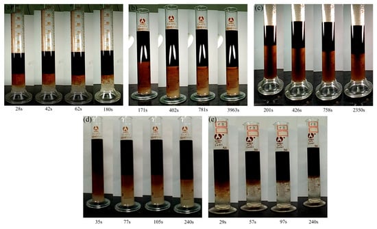 The role of asphaltenes in stabilizing maltenes-in-water emulsions can also be ascertained by comparing the emulsions with different asphaltene contents, as shown in Figure 6a and Figure 7a–c. It can be seen that the emulsions made by the organic phase containing asphaltenes are much more stable. The rate of demulsification becomes slower and the amount of emulsions increases when the asphaltene content in the oil phase increases. Asphaltenes formed a rigid skin at the oil–water interface, allowing the stability of the emulsions to be improved [25,26].