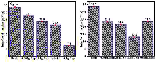 As shown in Figure 8, the interfacial tension decreases from 33.7 mN/m to 7.4 mN/m, when the asphaltene content increases from 0 to 17 g/L. Asphaltenes can adsorb at the oil-water interface; they form a protective layer; the oil-water interfacial tension decreases, and the layer could stabilize emulsions [25,27]. The interfacial tension decreases from 33.7 mN/m to 13.2 mN/m, when the SHT content increases from 0 to 11%. SHT works as a surfactant because it can decrease the oil–water interfacial tension, and this phenomenon can be found in the literature [6]. SHT enhances the adsorption of asphaltenes at the o/w interface, because the interfacial tension decreases from 23.9 mN/m to 21.6 mN/m when SHT is added to the asphaltene solution. Et3N could decrease the o/w interfacial tension from 33.7 mN/m to 23.6 mN/m. SHT easily resolves Et3N under N2, and both SHT and Et3N can decrease the oil–water interfacial tension. The combination of asphaltenes and SHT is observed to be helpful for the reduction of the oil–water interfacial tension.