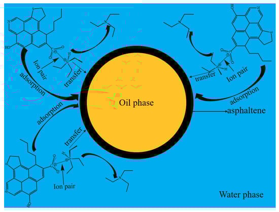 The synergistic effect of SHT and asphaltenes on stabilizing maltenes-in-water emulsions is shown in Figure 9. SHT can help asphaltenes to adsorb at the o/w interface by forming ion pairs. It is easy to transfer the oil–water interface and this helps asphaltenes adsorb at the o/w interface. Asphaltenes that accumulate at the oil-water interface could hinder demulsification. Asphaltenes could adsorb at the oil–water interface by themselves, and the presence of SHT will facilitate the stability of the oil–water emulsions.