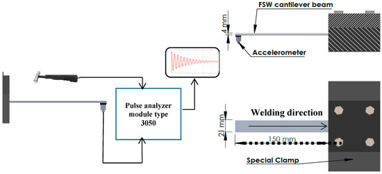 Samples were prepared as a cantilever beam with one free end and fixed using a special clamp. The net fixed dimensions of the tested cantilever beam were 150 mm long, 21 mm wide, and 4 mm thick. The vibration signal was acquired using a piezoelectric CCLD accelerometer. The accelerometer was mounted using plastic clips. An impact hammer with a force transducer was used to excite the welded joint. Vibration analysis was performed using a LAN-XI (3050 A-60 Bruel&Kjaer, Nærum, Denmark). The data acquisition system was a 6-channel input module, with a frequency range of (0–51 KHz), FFT resolution up to 6400 lines. Figure 3 shows the apparatus used in the investigation. The specific damping ratio, natural frequency, and frequency response function were analyzed using post-processing software ME’Scope (Vibrant Technology, Centennial, CO, USA) and verified using theoretical methods. The test was repeated 10 times for each sample in order to attain the optimum value through average readings.