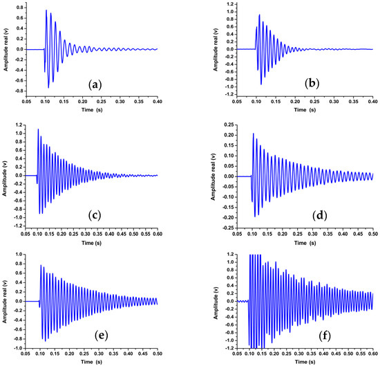 Transient response acquired from the free vibration impact test at (a) 600 rpm with a welding rate of 16 mm/min, (b) 1500 rpm with a welding rate of 52 mm/min, (c) 1500 rpm with a welding rate of 110 mm/min, (d) 600 rpm with a welding rate of 110 mm/min, (e) 1200 rpm with a welding rate of 32 mm/min, and (f) 1000 rpm with a welding rate of 110 mm/min.