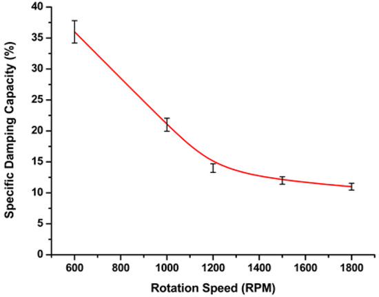 The effect of FSW processing parameters, such as the welding speed rate and tool rotation speed, on the formation of defects was observed using the variance in the damping capacities in the tested welds. The specific damping capacity and the FSW tool rotation speed (ω, rpm) were formulated using the regression analysis in Equation (4). As this represents the regression model, we formulated the relationship between the processing parameters (rotation speed) of friction stir welding and the corresponding damping ratio. At a lower rotation speed, the specific damping capacities have higher values than at high speeds, as shown in Figure 5.