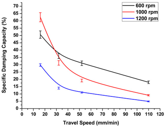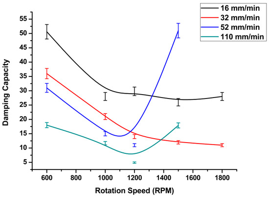 In addition to the rotation speed, one of the main processing parameters that affects the friction stir welding process is the traverse speed (welding rate) (v, mm/min). From the experimental results, we observed that whenever the welding rate increased, the heat generated during the friction stirring process decreased. The specific damping capacity decreased nonlinearly with respect to the welding speed, as shown in Figure 6. From the above, higher tool rotation speeds and the corresponding welding speeds caused an increase in damping capacity values, which were reflected in the quality of the welding process, causing defective welds. However, all welding speeds at low rotation speeds show a significant increase in damping values, as shown in Figure 7. Higher welding speeds, with a corresponding tool rotation speed of above 1100 rpm, showed a dramatic increase in damping ratio. This can be explained by the fact that a higher rotation speed, when processed at a high welding rate, causes insufficient heat in the stirring zone. Therefore, defects will form during the welding process and, consequently, the damping ratio increases.