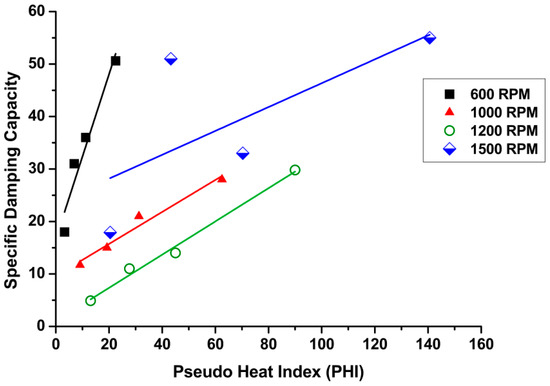 The ratio of the square of the tool rotation speed to linear welding speed is defined as the pseudo heat index (PHI). This method is used to predict the net heat generated during friction stir welding [36]. Figure 9 represents the relationship between the PHI and the specific damping capacity for all rotation speeds and corresponding traverse speeds. It can be seen that any significant increases in the heat index parameter led to increases in the damping capacity. Therefore, it was possible to predict the presence of defects in welding, especially when both parameters increased.