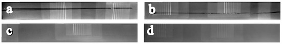 In this test, the welded joints were subjected to a nondestructive radiography scan (YMGI, YXLON, Hudson, NY, USA), to inspect the internal defects of all the samples. The test was performed according to E 1032–95, the Standard Test Method for Radiographic Examination of Weldments. The main purpose of this test was to verify the current investigation using a traditional nondestructive test. The radiography scan uses an X-ray beam projected onto the welded joints. The depth of the defect in the direction of the radiation beam was obtained from the density profile of the defect. As shown in Figure 10, the majority of the defective joints had a tunnel defect, as shown in Figure 10a,b. The results were consistent with the dynamic properties and specific damping capacity. In contrast, the radiography scan did not show any variation in the density profile for defect-free samples, as shown in Figure 10c,d.
