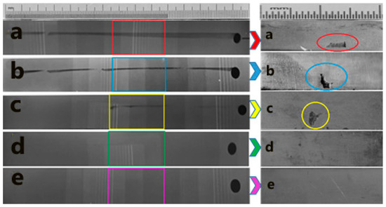 Radiography scan with corresponding section using macro-scan: (a): 600 rpm with a welding rate of 16 mm/min, (b) 1500 rpm with a welding rate of 52 mm/min, (c) 1800 rpm with a welding rate of 32 mm/min, (d) 1200 rpm with a welding rate of 32 mm/min, and (e) 1000 rpm with a welding rate of 110 mm/min.