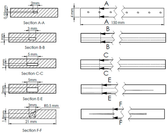 Different designs of FSW defects used in finite element analysis (FEA) simulation. (A) linear porous defect, (B) regular tunnel type B, (C) regular tunnel type C, (E) taper rectangle tunnel, and (F) intermittent taper triangle tunnel.