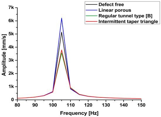 All the calculations and essential data were collected based on the previous processing step. The frequency range was adjusted to 0 to 150 Hz according to the natural frequency calculation in the first step. Six models were built and simulated using finite element software (ANSYS, ANSYS Inc, Canonsburg, PA, USA). In the present investigation there are six types of welding defect have been simulated using finite element analysis software Each model represented a welded joint under certain defects, except the first one, which was defect-free. The models simulate some of the common experimental defects generated during welding process. The models were designed to form defects varying from the smallest to the largest in size. Linear porous defect in section A-A represents the smaller defect. The other models represent: regular tunnel type section B-B, regular tunnel type section C-C, taper rectangle tunnel section E-E, and intermittent taper triangle tunnel section F-F. Table 5 presents the results of the simulation of different designs of defects. The results revealed that the values of the natural frequency of the welded joint were very close, whether defective or not, because the size of the defect does not significantly affect the mass, which impacts the natural frequency. Close natural values were observed in small defects with the defect-free sample. Small defects, such as pores and small cracks, cannot be detected through the natural frequency of a metal because the variation in frequency is limited, as shown in Figure 13. Those defects significantly affected the welded structure. In the case of noticeable defects, the natural frequency can detect these defects, although the values of the defective sample frequencies converge with those of the defect-free sample, as shown in Figure 14. Table 6 presents a comparison of the results between the experimental and simulated natural frequency for the defect-free samples and for significant defects. The simulated results show that the natural frequency increases slightly with small detects, contrary to the experimental results, where the natural frequency tends to decrease as the defects increase.