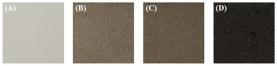Optical images of the PEO coatings formed in the electrolytes containing different amounts of CNT: (A) 0 g/L CNT; (B) 2.5 g/L CNT; (C) 5 g/L CNT and (D) 10 g/L CNT.