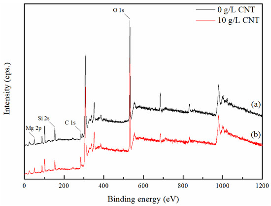 X-ray photoelectron spectroscopy (XPS) spectra of the PEO coatings in an electrolyte containing different concentration of CNT: (a) 0 g/L CNT; (b) 10 g/L CNT.