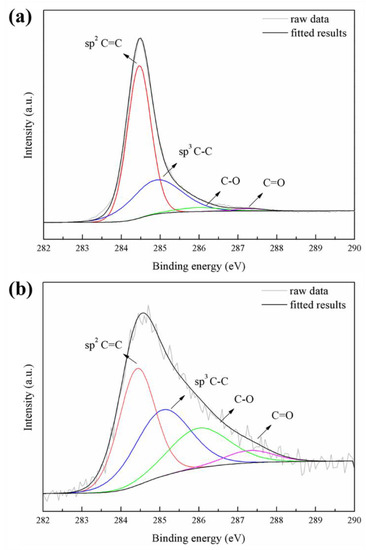 Figure 7 show the XPS spectra of the PEO coatings formed in an electrolyte with and without 10 g/L CNT additive. The XPS spectra detected Mg, O, Si, and C peaks. The C 1s peak of the CNT-free coating seems to be hydrocarbon contamination inside the XPS vacuum chamber [37]. In the case of the CNT-added coating, it is shown that the C 1s peak is significantly stronger than the PEO coating without CNT, and this increase in peak intensity means that CNT can be incorporated into the oxide film through the PEO process. Figure 8 represents the high-resolution spectra of the C 1s peak. Curve fitting was performed after a Shirley background subtraction by the mixed Gaussian–Lorentzian function. The C 1s signals on the pristine CNT and the incorporated CNT in the PEO coating at 284.4–284.6, 284.9–285.3, 286.0–286.4, and 287.3–287.7 eV corresponded to sp2 C=C, sp3 C–C, C–O, and C=O chemical bonding, respectively [38]. It was confirmed that CNT oxidation occurred during the PEO process due to the large increase of C–O and C=O signals compared to the signal of pristine CNT. The surface of the CNT was damaged by the excessive oxidation, and the length thereof was cut off, causing defects in the CNT that may lead to the deterioration of the CNT properties [39].