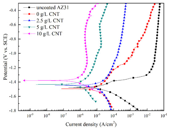 The potentiodynamic polarization curve of the AZ31 Mg alloy and the PEO coatings with different amounts of CNT additive in the electrolyte are shown in Figure 9. Corrosion potential (Ecorr), corrosion density (icorr), and the Tafel slope were used to characterize the corrosion resistance of the samples. The high corrosion potential and low corrosion current density indicate the improving corrosion resistance of the oxide film. The electrochemical parameters derived by the Tafel extrapolation technique are presented in Table 2. From Table 2, we can see that AZ31 Mg alloy has poor corrosion resistance due to high corrosion current density (−1.481 V) and low corrosion potential (1.12 × 10−5 A/cm2). On the other hand, as CNT concentration of the electrolyte increased in the PEO process, corrosion resistance was highly improved. In particular, for samples with 10 g/L CNT additive added to the electrolyte, the value of the corrosion current density was 4.80 × 10−7 A/cm2, a decrease of about two orders of magnitude relative to the uncoated AZ31 Mg alloy. These results demonstrate that the incorporation of a CNT additive into the oxide film improves the corrosion-resistance properties of the PEO coating.
