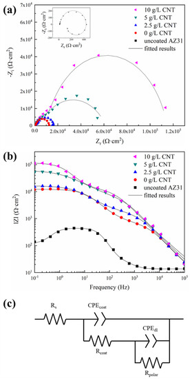 The fitting data using the equivalent circuit shown in Figure 10c are generally in agreement with the measured data, and the fitting valuesof the equivalent circuit components are shown in Table 3. As the amount of CNT added to the electrolytic solution increases, the value of Rcoat and Rpolar increase. When the CNT additive is added, porosity decreases and microcracks become finer in the PEO-coating layer. Furthermore, the presence of CNT in the corroding channel interferes with the conduction flow of ions, resulting in increased Rcoat. In addition, the CNT suppresses penetration of the corrosive ions into the magnesium substrate, so that the Rpolar is increased.