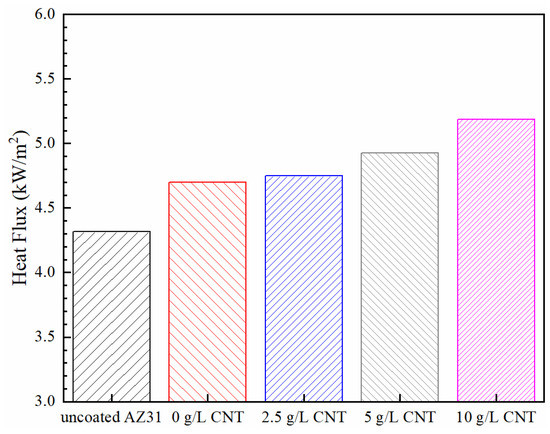 The heat flux of uncoated AZ31 and PEO coatings formed on the AZ31 Mg alloy specimens at different concentrations of CNT is shown in Figure 11. The heat flux of uncoated magnesium substrate was measured as 4317 W/m2. Higher heat flux than expected could be attributed to increasing emissivity by surface oxidation by the temperature of the setup and roughness due to polishing. The heat flux of the PEO-coating layer increased to 4700, 4748, 4924, and 5188 W/m2 as the addition amount of CNT increased to 0, 2.5, 5, and 10 g/L, respectively. This increase in the heat flux is presumably due to the increase in the thermal conductivity by the CNT with high thermal conductivity in the PEO-coating layer, the decrease of the thickness of the PEO ceramic coatings that interfere with the thermal conduction, and the increase in the emissivity by CNT with high emissivity located on the coating surface.