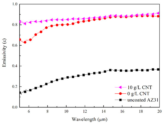 Figure 12 shows the emissivity of AZ31 Mg alloys and PEO films with and without CNT additives in the electrolyte. The AZ31 magnesium substrate had a low emissivity value of 0.298 in 5–20 μm due to poor photon-emission efficiency from the surface. An emissivity higher than the reported emissivity of ~0.13 appeared to occur due to surface oxidation and roughness from polishing [41,42]. In contrast, the emissivity of the PEO-coated sample without CNT was 0.818. Despite significantly higher emissivity compared to the emissivity of the substrate, the thermal-radiation performance of the PEO film without CNT is hampered by high reflectivity. The emissivity of the CNT-added PEO film was measured to be 0.867. The PEO film with 10 g/L CNT additive, and a dark surface from incorporating a large amount of CNT, showed the highest emissivity due to the effect of high-emissivity CNT. In particular, the addition of CNT significantly increased emissivity in the range of 5–8 μm. The emissivity-enhancement effect of CNT in this study is similar to the effects reported in the literature [43].