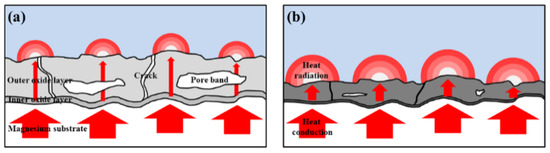 Emissivity of PEO coatings with and without CNT and the AZ31 Mg substrate measured at 100 °C, via Fourier transform infrared spectroscopy (FT-IR). Figure 13 shows the heat-transfer mechanism of the PEO coating with and without CNT additive. The thermal conductivity of MgO acting as an thermal insulator in the coating layer was quite low, at about 30 W⋅m−1⋅k−1 [44]. However, the composite PEO coating could improve thermal conductivity by incorporating a CNT additive with high thermal conductivity (2000–6000 W⋅m−1·k−1) into the oxide layer [45]. In addition, the PEO coating with a CNT additive has a thin and dense structure. When the thickness of the coating was thin, the distance of the heat-conduction path having low thermal conductivity was shortened. The size of the pore band also decreased, and the area of the heat-obstructing vacancies was reduced, thereby exhibiting improvement in heat-conductive ability. When the heat is transferred to the coating surface, a high emissivity oxide coating with a CNT additive caused a large amount of thermal radiation, which improved the heat-dissipation capability of the PEO coating.