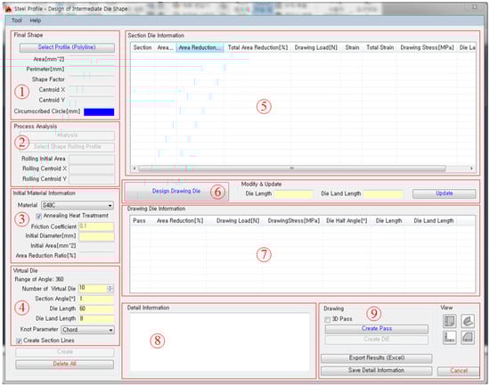 - The developed process design system is operated through a user-friendly GUI window. This window provides the user with diverse information including the final shape, the reduction area, the drawing load, the drawing stress, and the strain. Based on this information, as well as the designer’s experience, the process design can be carried out.