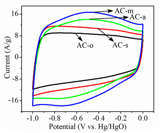 Clearly, the obviously enhanced capacitive behavior of the treated sample shown on the CV curves (Figure 4) was an evident consequence of pseudocapacitance in the KOH electrolytes. As is well known, power energy can be stored in carbon-based materials via the well-defined electric double layer mechanism, as observed here on AC-o. However, the pronounced redox peaks in CV curves clearly manifested that a new energy storage mechanism had occurred on AC-a and AC-m. This new mechanism was closely linked to the surface redox reactions, thus introducing the pseudocapacitance.