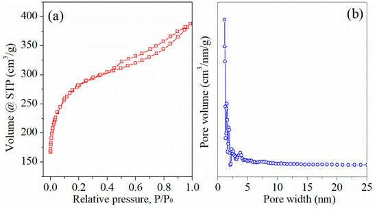 Inexpensive, stable, and much efficient energy storage devices are very crucial for the growing demand for sustainable energy and electric vehicles. Supercapacitors (SCs) have been extensively acknowledged as backup power devices, energy conservation, and power tools, and are expanding their applications in electrical vehicles [1,2,3,4]. A broad variety of appropriate electrode composites have been explored, mainly built upon charge accommodation at the electric double layer and the occurrence of Faradaic reactions [5]. These electrode materials are mainly constituted by metal oxides, conductive polymers, and porous carbon materials. Of the extensively studied electrode materials of transition metal oxides, RuO2 displayed the excellent initial electrochemical performance, whereas the cost of precious metal oxides and difficulties in large-scale production limited its practical applications [6,7]. Likewise, conductive polymers possessed lots of shortcomings, e.g., poor stability. Therefore, porous carbon materials have emerged as the most potential alternative, owing to their cheapness, high supply, outstanding conductivity, eco-friendliness, and steady structural characteristics.