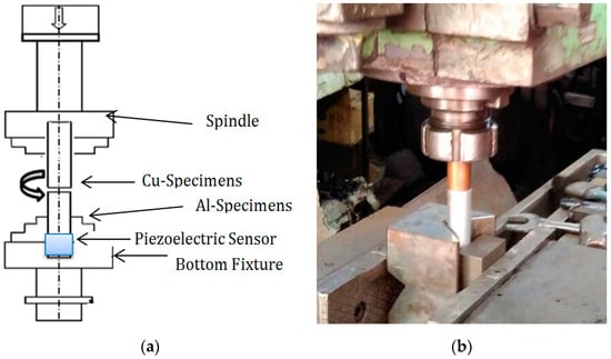 (a) Schematic layout of the friction welding process. (b) Experimental set-up.