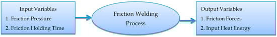 In many industrial applications, friction welding (FW) processes can replace traditional joining methods. This is due to its capability of high performance in joining different ferrous and non-ferrous metals [1]. One of the important aspects in this process is that it is considered as a solid-state process. The maximum temperature attained during welding does not exceed the melting points of one of the two metals. Friction welding of dissimilar metals utilizes heat generated due to friction between the one rotating metallic surface and another held stationary in a chuck [2]. Continuous friction on the stationary metallic surface is maintained so that the heat generated will continue to rise to a critical temperature below the melting point and both metals are welded. The friction welding process has attracted many researchers due to its solid-state process and short welding time, which can reduce the thermal compatibility between the base parent materials [3]. Sound quality joints were thus proved to be stronger from friction welding of dissimilar joints [4,5,6,7,8,9]. The mechanical properties of the welded joints can be improved by reducing the interfacial metallic thickness of the welded zone of dissimilar metals. The thickness of the interfacial metallic layer can be minimized by optimizing the process parameters and metallic composition of the weld metal [10]. Paventhan et al. explored the optimization and predicted the process parameters that affect the aluminum-steel dissimilar joint strength and quality [11,12,13,14,15]. The most critical aspects in friction welding when compared with other welding processes are the high joint strength and lesser processing time. Many researchers [16,17,18] have compared dissimilar joints obtained by friction welding and the friction stir welding process [19,20]. The effect of process parameters, such as friction pressure, on the properties of hot rolled super alloys has been reported by Hakan Ates et al. [21]. Afes Hakan and Sathiya Paulraj et al. [22,23] explained that the grains of the friction welded area are refined at the welded interface due to the severe plastic deformation, which results in enhancement of mechanical properties [22,23]. Gontarz et al. [24] explored the effect of process parameters in joining Al-Mg at elevated temperatures and estimated the coefficient of friction. In this research work, the image segmentation technique was used to quantify the flaws at the welded interface and establish a correlation within the two dissimilar metals to be welded to predict the optimal operating process parameters, which were experimentally validated. Then, tests were carried out to check the weld quality in terms of crack detection and the fractured surface of the welded joint. It was demonstrated that a good weld quality joint can be obtained by using optimized process parameters. The proposed methodology of image segmentation was successfully implemented in evaluating the fractured surface and crack detection on the welded surface. The experimental results showed that the effect of the coefficient of friction plays a vital role in the welding quality. In the present work, traditional solid state welding, i.e., the friction welding process, was applied.