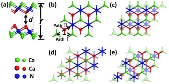 Density functional theory (DFT) calculations were implemented in the Vienna ab initio Simulation Package (VASP) [29]. The projector-augmented-wave (PAW) method was utilized to model the core electrons and the generalized gradient approximation (GGA), while the Perdew–Burke–Ernzerhof (PBE) functional was employed to describe the exchange and correlation effect [30,31]. The DFT-D2 method was applied to describe the vdW interactions [32], and the default scaling parameter of 0.75 was adopted. A plane-wave cutoff of 600 eV and Monkhorst-Pack grids of 25 × 25 × 1 were used for Brillouin-zone integration [33]. A (1 × 1) surface cell separated by at least a 15-Å vacuum was used to simulate the sliding model. Total energy was converged up to 10−5 eV for electronic relaxations. For calculating the band structures, we used Gaussian smearing in combination with a small width of 0.05 eV, and the integration path in the first Brillouin zone was along Γ(0, 0, 0)-Κ(2/3, 1/3, 0)-Μ(1/2, 0, 0)-Γ(0, 0, 0). All internal coordinates were relaxed until the Hellmann–Feynman forces were less than 0.01 eV/Å to optimize geometries. The method of Zhong et al. [13], which has successfully calculated several systems, was employed to calculate the interlayer friction properties of the Ca2N system [34,35,36,37]. It should be noted that the method only evaluated the maximum energy barrier caused by variations of the chemical bond strength and the work against an external force along the sliding path, but did not consider the energy dissipation. Therefore, the friction in the study belongs to static friction.
