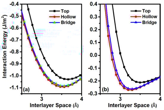As friction is closely related to the interfacial interaction, we firstly calculated the interaction energy (IE) of the sliding system. IE is defined as the energy of the combined system minus the energy sum of the component films, and was calculated by using the formula , where is the total energy of the two contacting films at the distance of r and is the energy of the separate film. The vertical distance between the bottom and top Ca layers is defined as r, as shown in Figure 1a. The load effect was applied by setting different r values. For each interlayer distance r, only the Ca atoms in the bottom layer of the lower slab and the topmost layer of the upper slab were kept frozen, whereas all other atoms were relaxed in all of our calculations. According to the definition of IE, a more negative IE indicates better stability. The calculated IEs as a function of r for top, bridge, and hollow stackings are shown in Figure 2a. For comparison, the IEs for the bilayer graphene system are also presented in Figure 2b. Comparisons of IEs in different stackings reveal that both systems have the weakest interaction at the top stacking, followed by the bridge one, while the hollow stacking has the strongest values. This behavior occurs because interfacial Ca atoms exhibit large spaces for movement and avoid repulsive forces at both the hollow and bridge stackings. These results indicate that the hollow stacking has the largest binding energy (the absolute value of the minimum IE) and is the most stable stacking configuration. To reveal the difference of interlayer binding style between the two systems, we compared the IEs for the two systems. The most striking difference between the two systems is that the IEs for the Ca2N system (approximately 1 J/m2) is about five times larger than that of the graphene systems (typical physical adsorption of about 0.1 J/m2). Therefore, the chemical interlayer bonding character of the Ca2N system is dramatically different than the vdW interaction within the graphite system [34]. We next considered the relative difference of IEs between the top and hollow stackings for the two systems. The IE difference at the equilibrium adsorption position is about 0.063 J/m2 for Ca2N system, which is comparable with that of the graphene system (about 0.058 J/m2). We also examined the influence of vdW on the IE in Ca2N, and found that the IE difference is virtually unchanged if PBE is used without vdW corrections. These results illustrate that although the two systems have different bonding energies, the difference of binding energy among different stackings is comparable. Interfacial space d (as shown in Figure 1a) is another important value for friction calculations, and the calculated values are 3.57 Å and 3.25 Å for Ca2N and graphene, respectively. From the comparisons we can see that the Ca2N system has a larger interfacial space than that of the graphene system. Therefore, excellent friction behaviors are expected for the Ca2N system in the view of its IE and interfacial space.