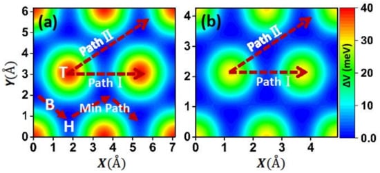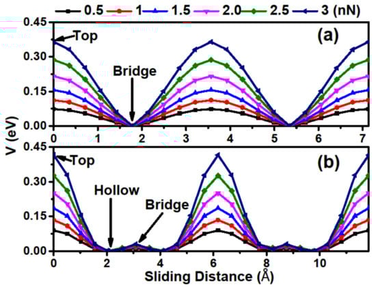 We next investigated the detailed frictional properties along the two chosen directions by Zhong’s method [13], and more details of the calculating process can be found in our previous works [34,35,36]. Figure 4 exhibits the potential barrier V along the sliding path, in which the hollow stacking at path I and the bridge stacking at path II are set to 0 eV. From the figure, one can see that the relative V curves periodically fluctuate along the sliding directions, with a maximum at the top stacking and a minimum at the bridge and hollow stackings for paths I and II, respectively. We also considered the load effect, which can be obtained by differentiating the fitted interaction energy function with respect to the interlayer distance [34]. It was found that V increases and its curve becomes steeper with increasing loads, indicating that relative sliding is difficult to achieve under high loads. Another important characteristic is that the disparity of the potential barrier amplitude between two paths is not obvious, suggesting that Ca2N has an isotropous mean interlayer friction behavior.