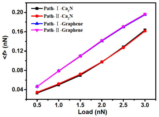 The mean friction force <f> was calculated by dividing the maximum potential barrier by the distance between the two nearest neighbor maximum energies in the sliding direction, as shown in Figure 5. First of all, the curves of <f> for both paths are almost coincident throughout the calculated normal forces, which further illustrates that the interfacial friction is isotropous for the Ca2N system. By comparison, we also calculated the interfacial <f> of the bilayer graphene system. From the comparisons of <f> in Figure 5, it can be seen that the Ca2N system has lower friction than the graphene system for all chosen loads, which indicates that layered materials with stronger binding can have lower friction, and that friction is closely related to the IEs difference for different stackings but not the absolute IE. It should be noticed that Zhong’s method can successfully deal with the vdW binding layered materials, but it underestimates frictional forces in metallic systems [14]. It is doubtful whether this method is suitable for the calculation of larger adsorption layered systems. However, as the constructed PBS of the Ca2N system has the same tendency as the friction calculation by Zhong’s method, the calculated results here are reliable. It also should be emphasized that, although these results reveal static friction at 0 K, and the effects of velocity and temperature must affect the quantitative estimate, such effects will not break the significant ground state mechanism of atomic-level friction. Therefore, bilayer or multilayer Ca2N systems may be promising candidates for nanolubricant or coating materials. Additionally, first-principles calculations have also been employed to predict two other 2D electride alkaline earth subnitrides, Sr2N and Ba2N [21,22], and it was found that they are stable down to monolayer thickness [23]. As these materials have structures similar to that of Ca2N, we can infer that this class of materials has excellent friction properties.