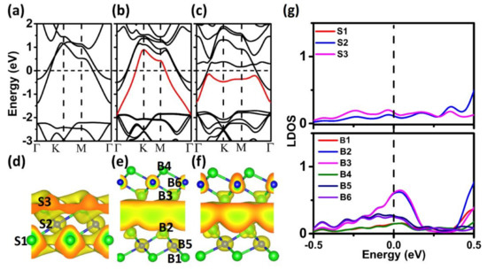 The vdW interlayer interaction is the main mechanism of traditional solid lubricants. Due to the different interlayer bonding styles, the ultralow friction mechanism of the Ca2N system may be fundamentally different from that of the vdW layered lubricants. To reveal the ultralow friction mechanism, we calculated the electronic structures of the Ca2N system, as shown in Figure 6. The monolayer Ca2N is metallic with two bands crossing the Fermi level (Figure 6a), and the corresponding partial electron density shows that the two bands are from the 2D-confined electron layers residing at the two sides of [Ca2N]+ (Figure 6d). However, when the two sheets are joined, an additional band induced by the coupling effect between the two layers appears, which is mainly from the 2D electron layers confined in the interlayer regions (Figure 6b). As the additional band also crosses the Fermi level, the electrons confined in the interlayer regions are loosely bound conduction electrons, suggesting that the delocalized 2D charge is distributed uniformly in the interlayer space of the Ca2N system (Figure 6d), which yields similar IEs at different stackings and smooth V. To obtain more information about charge distribution, we plotted the local density of states (LDOS) for monolayer and bilayer Ca2N samples. Compared to the monolayer system, there is a clear peak at the Fermi level in the bilayer system, which comes from the two Ca atoms at the interface (B2 and B3 in Figure 6e). These results indicate that electrons confined in the interlayer regions are loosely bound conduction electrons, which is consistent with the above charge redistribution. Therefore, uniform interfacial charge distribution is the main cause of the ultralow friction mechanism of the layered Ca2N. For a larger load, the additional band becomes flat and drops below the Fermi level (Figure 6c,f). These results indicate that the confined effect becomes stronger and the homogeneity of the interfacial charge distribution decreases with the increase of the load, which can explain the larger V and friction under the larger load. It should be noted that our results are in contrast to the findings of Wolloch et al., as larger adhesion corresponds to larger interlayer friction [20]. This controversy may be attributed to the unique geometric and electronic structures of the Ca2N system. The large interfacial space, strong adsorption, and unique 2D uniform interfacial charge distribution make it dramatically different from any other material in their calculations [20].