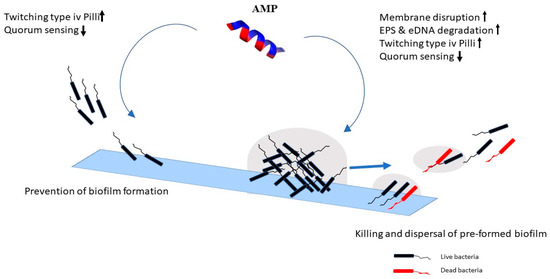 Anti-biofilm activity and mechanism of action of antimicrobial peptides (AMPs). AMPs effect mainly involve prevention of bacterial attachment and inhibition of biofilm formation or disruption of pre-formed biofilms.
