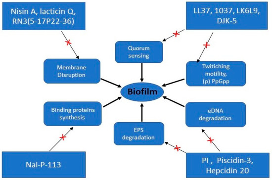Representation of the different targets of anti-biofilm AMPs. × signs indicate inhibition and/or action on targets sites.