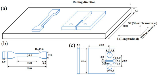 Schematic diagrams showing the specimens for tensile and fatigue crack propagation (FCP) tests: (a) the orientation and location of the specimens taken from the rolling plates, the geometry and dimensions of the (b) tensile and (c) FCP specimens. (unit in mm).