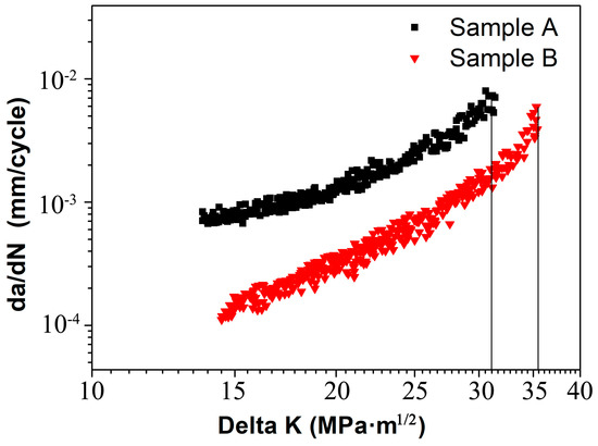 The results of tensile tests are given in Table 2. The variation of FCP rates, da/dN, with stress intensity range, ΔK for samples A and B are shown in Figure 2. Sample B exhibits lower FCP rate than sample A. For instance, at ΔK = 15 MPa·m1/2, FCP rates of samples A and B were respectively 8.15 × 10−4 and 1.54 × 10−4 mm/cycle. Likewise, in the final stage (ΔK = 30 MPa·m1/2), FCP rates of samples A and B are respectively up to 6.25 × 10−3 and 1.59 × 10−3 mm/cycle. It is clear that sample B presents higher FCP resistance. Besides, sample B possesses higher damage tolerance (35.5 MPa·m1/2) than sample A (31 MPa·m1/2).