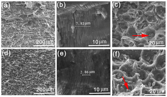 Figure 4 shows the fatigue fracture surfaces in different stages of samples A and B. In Figure 4a,d (ΔK = 15 MPa·m1/2), since the shear deformation plays a dominant role in this stage, the typical features are characterized by beach marks that are roughly paralleled to the FCP direction. Moreover, fatigue plateaus connecting with each other by tear ridges are also detected in both samples. Interestingly, sample B exhibits more microscopic voids as compare to sample A. Srivatsan et al. [25] revealed that these microscopic voids were mainly due to the localized plasticity deformation around the coarse second-phase particles. Figure 4b,e show the fatigue fractures of various samples in Paris regime (ΔK = 23 MPa·m1/2). The values in Figure 4b,e are the spacing of ten fatigue striations that we measured with the Nano Measurer software. Sample B possesses finer fatigue striations than sample A. When cracks extend to the high ΔK regime (ΔK = 30 MPa·m1/2), the fatigue fracture surfaces are mainly composed of dispersed dimples. It also should be noted that there are some particles in the center of the dimples and some of them are broken (as seen in Figure 3c,f). Energy spectrum analysis indicates the atomic ratios (Al:Cu:Mg) of the detected particles (see red arrows in Figure 3c,f) are 57.13:25.56:12.34 and 60.72:22.71:13.81, respectively. These second particles are probably S (Al2CuMg) phase.