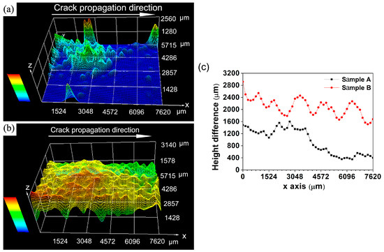 Figure 6 illustrates the three-dimensional fatigue fracture surfaces of samples A and B. In order to gain a more thorough understanding of the effect of roughness induced crack closure (RICC) on the FCP rate, the height difference of fatigue fracture surface is calculated via KH7700 3DViewer (see Figure 6c, Hirox, Tokyo, Japan). Apparently, sample B possesses a relative rougher fatigue fracture surface than sample A. Besides, the height difference of fatigue fracture surface of sample B is much higher than that of sample A.