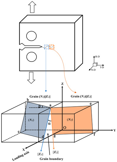 As analyzed above, precise quantitative is required to study the influence of grain orientations on FCP resistance. Wu et al. [28] proposed a crystallographic model to calculate the twist angle and tilt angle but this model was only applicable for near-threshold regime. Generally, in Paris regime, the crack tip plastic deformation is distinctly different from that in near-threshold regime. Thus, in order to accurately study the influence of grain orientations on FCP resistance in fatigue stage II, a modified crystallographic model for evaluate the twist angle and tilt angle component boundaries is established in the present work. Figure 8 illustrates the orientation relationship of two adjacent grains. Actually, the blue crystal plane (N1) and crystal direction [E1] of the marked grain 1 should be kept parallel to the orange one, because they are parallel to the surface of the EBSD specimen. Hence, in order to keep parallel with the orange crystal plane, the blue direction [E1] of grain 1 should firstly rotate around the normal unit vector of grain boundary (define as Z) until the crystal direction of [E1] is parallel to [E2] and then the rotated blue crystal plane (N1’) also must be rotated again along the ag line until the two crystal planes are parallel. By this rotation, the grain boundary characteristic such as twist angle and tilt angle can be determined quantitatively. The twist angle can be expressed by:
