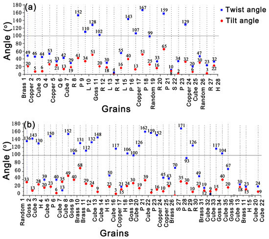 The calculated twist angle α and tilt angle β are shown in Figure 9. It is apparent that fatigue crack in sample A deflects severely by P-grains (see grains 9, 16, 18, 21 and 23 in Figure 7a). The twist angles of R-grain 8 and P-grain 9, L-grain 15 and P-grain 16, Copper-grain 17 and P-grain 18, R-grain 20 and P-grain 21, Copper-grain 24 and P-grain 23 are respectively 152°, 143°, 167°, 159°and 129°. The large twist angle induces great crack deflection or retardation at those grain boundaries, which is responsible for the enhanced FCP resistance. Similarly, for sample B, P-grains 6, 12, 21, 23, 28 and 29 are also detected to possess large twist angle of 112–171° with adjacent grains and crack deflections occur at those grain boundaries accordingly. For instance, a great crack deflection is observed when fatigue crack develops across the boundary of Cube-grain 5 and P-grain 6, as the twist angle of P-grain 6 with Cube-grain 5 is extremely large reaching 150°. Fatigue crack propagates along the boundary of P-grain 21 and penetrates through Cube-grains 20 and 22 directly. This is because the twist angle between P-grain 21 with Cube-grain 20 is 126° and that of P-grain 21 with Cube-grain 22 is 162°. However, the twist angle of Cube-grains 20 and 22 is only 24°. Likewise, the main fatigue crack is obstructed by P-grain 23 when the crack tries to from Cube-grain 22 into P-grain 23, then the crack retraces its way back to Cube-grain 22, as the twist angle between P-grain 23 and Cube-grain 22 is 159°. Besides, it should be note that the main fatigue crack is obstructed by P-grain 12, subsequently divides into two branches and propagates through Cube-grain 13 and H-grain 15, respectively. This is because the twist angle between P-grain 12 and Brass-grain 11 is 112°. However, Brass-grain 11 is observed to have a small twist angle with Cube-grain 13 (about 30°) and H-grain 15 (about 23°), which contribute to little resistance to FCP. Therefore, fatigue crack propagates through Cube-grain 13 and H-grain 15 but arrests by P-grain 12. Based on these results, it can be concluded that the twist angle component boundary plays a major role in controlling crack deflection and retardation. Obviously, P-grains possessing large twist angle with neighboring grains present high FCP resistance.