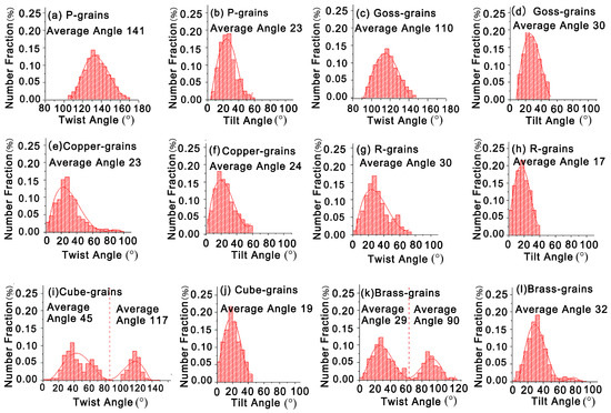 The twist angle and tilt angle distribution of P-grains with its neighboring grains (a,b); Goss-grains with its neighboring grains (c,d); Copper-grains with its neighboring grains (e,f); R-grains with its neighboring grains (g,h); Cube-grains with its neighboring grains (i,j); Brass-grains with its neighboring grains (k,l).