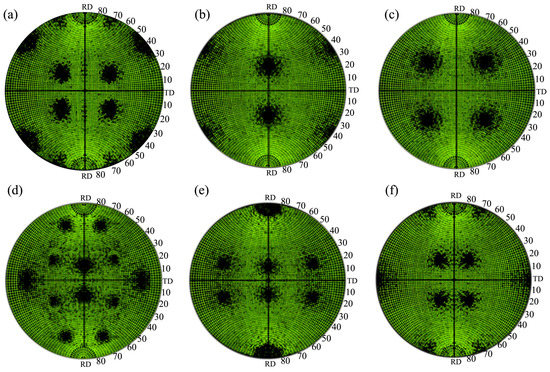 {111} pole figures of various standard textures: (a) P-texture, (b) Goss-texture, (c) Cube-texture, (d) R-texture, (e) Copper-texture and (f) Brass-texture.