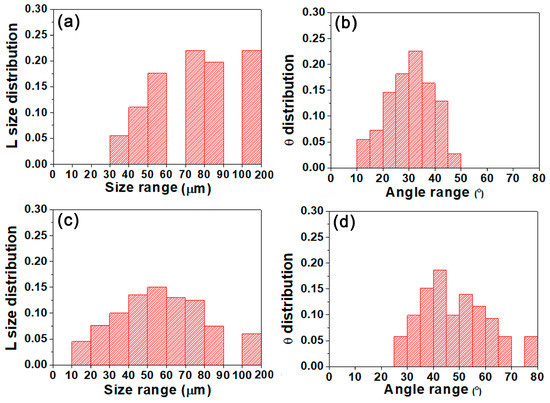 The distribution of L and θ for sample A (a,b) and sample B (c,d).
